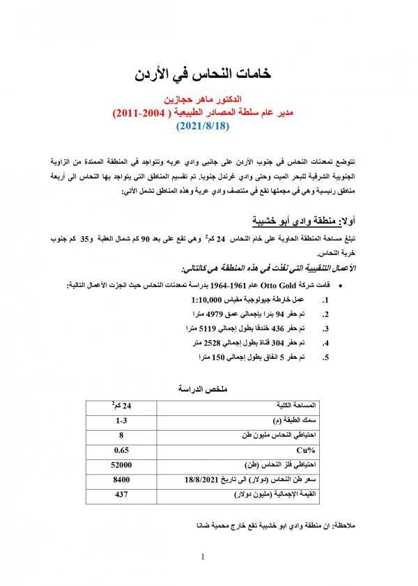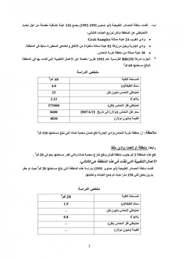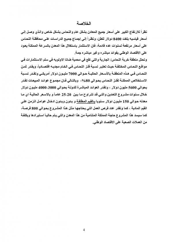 وبين أن منطقة خربة النحاس/ الجارية والتي تقع في محمية ضانا هي أولوية في سلم الاستثمارات في مواقع النحاس المختلفة، لافتا إلى أن نسبة فلز النحاس في الخام مجدية اقتصاديا وتقدر بـ 7000 مليون دولار أمريكي، فيما تقدر نسبة الاستخلاص الممكنة لفلز النحاس بحوالي 80%.