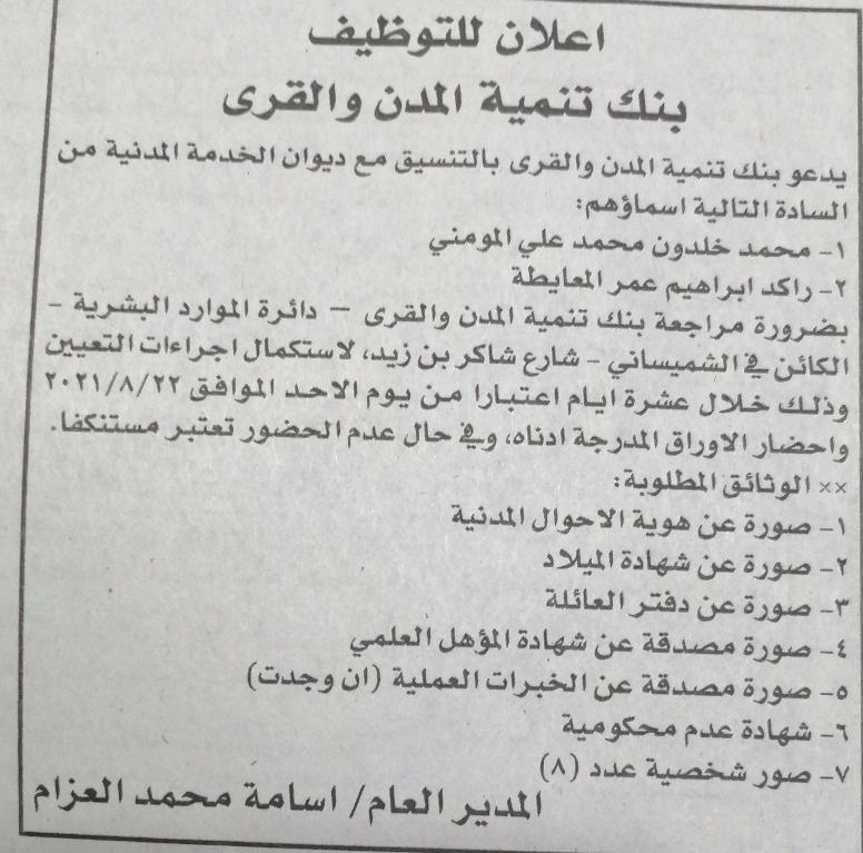 دعا بنك تنمية المدن والقرى وبالتنسيق مع ديوان الخدمة المدنية كل من الاسماء التالية : محمد خلدون محمد علي المومني و راكد ابراهيم عمر المعايطة المراجعة لاستكمال اجراءات تعيينهم خلال عشرة ايام وفقًا للاعلان الذي اطلعت عليه نيروز .