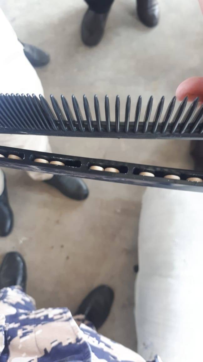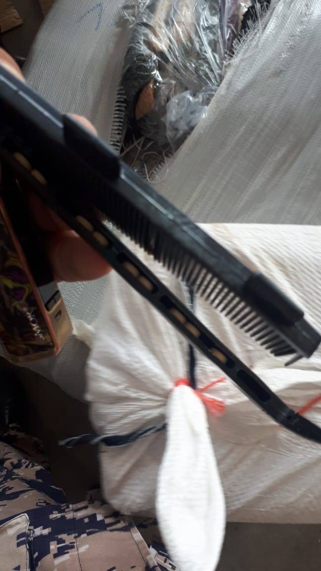 وأضاف الناطق الاعلامي بأنه تم ضبط المحتويأت اثناء المعاينة الفعلية لشاحنتين قادمين من دولة عربية مجاورة محملتان بالالبسة والإكسسوارات  والحجر  ومخبأة بطريقة احترافية داخل (الأحجار وامشاط الشعر)