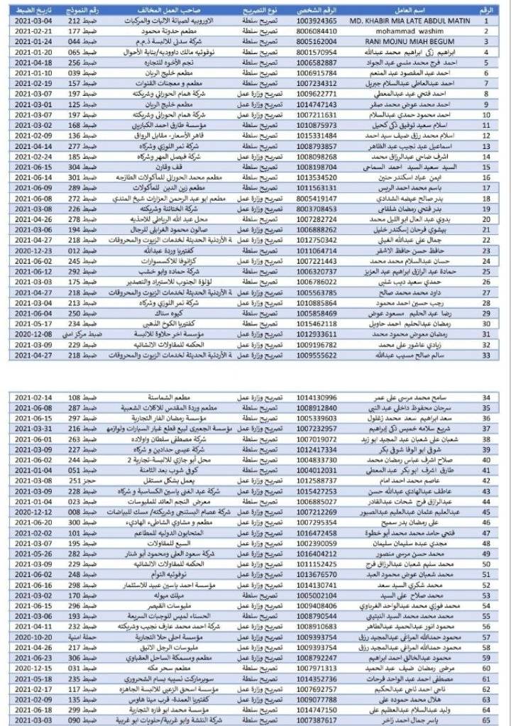 وأضافت : تُهيب السلطة أصحاب المؤسسات والعمالة الوافدة الواردة في الكشف المرفق المبادرة لتصويب وضعهم القانوني او تزويد قسم تفتيش العمل لدى السلطة ما يثبت مغادرة البلاد أو تجديد التصريح لدى وزارة العمل علماً وبموجب قرار مجلس الوزراء سيتم إبعاد أي عامل وافد مضى على انتهاء تصريحه ثلاثة أشهر واكثر عن أراضي المملكة.