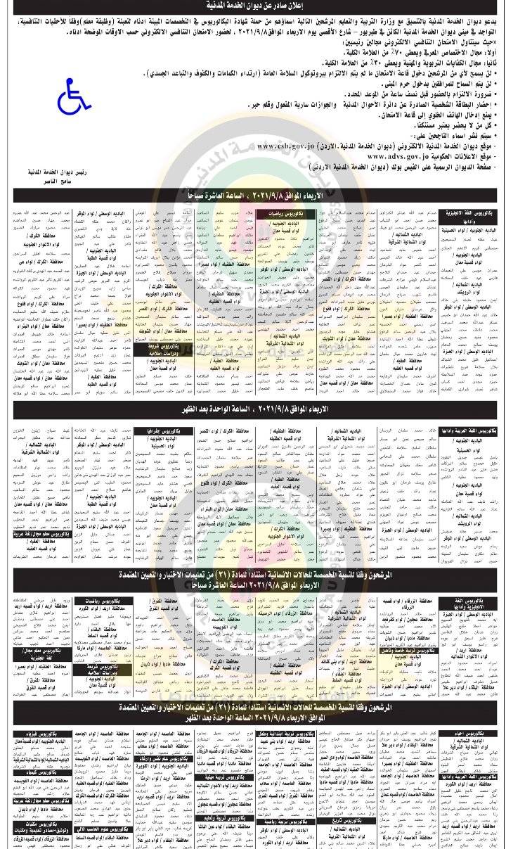 اسماء المدعوين لحضور الامتحان التنافسي الالكتروني لتعبئة وظيفة (معلم) وفقاً للاحقيات التنافسية بتاريخ 8/9/2021 في مبنى ديوان الخدمة المدنية.