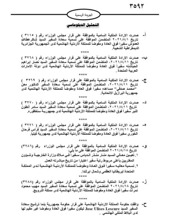 وبحسب الجريدة الرسمية، فقد صدرت الإرادة الملكية بتسمية معن مساعدة سفيرا للأردن لدى البرازيل، والسفير سامر النبر سفيرا للمملكة لدى سنغافورة.