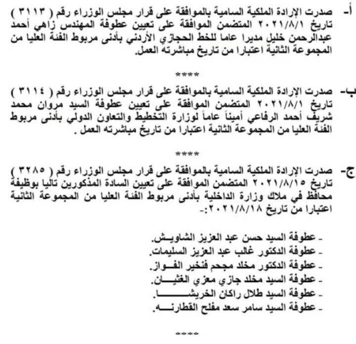 وصدرت الإرادة الملكية السامية بتعيين مجموعة من المحافظين: حسن الشاويش وغالب السليمات ومخلد الغثيان وطلال الخريشا وسامر القطارنة.
