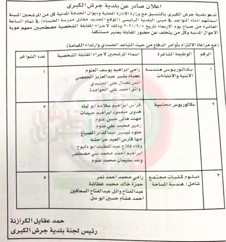 مدعوون للتعيين في بلدية جرش (أسماء)