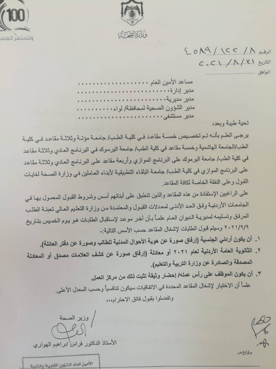 وأضافت الوزارة أنه على من يرغب الاستفادة من هذه المقاعد وتنطبق على أبنائهم أسس وشروط القبول المعمول بها في الجامعات الأردنية وفق الحد الأدنى لمعدلات القبول والمعتمدة من وزارة التعليم العالي تعبئة الطلب المرفق وتسليمه لمديرية الديوان العام علما بأن أخر موعد لاستقبال الطلبات هو يوم الخميس الموافق 9 أيلول.