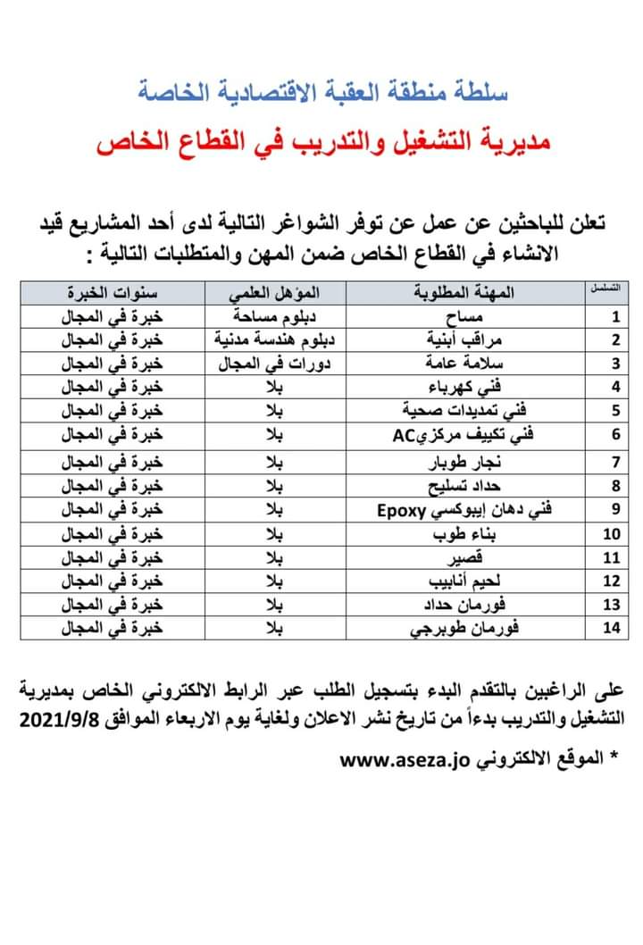 اعلان صادر عن سلطة منطقة العقبة الاقتصادية الخاصة من خلال مديرية التدريب والتشغيل في القطاع الخاص للباحثين عن فرصة عمل.