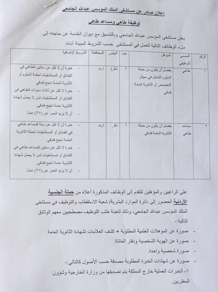 يعلن مستشفى الملك المؤسس عبدالله الجامعي عن توفر فرص عمل طاهي ومساعد طاهي وبالتنسيق مع ديوان الخدمة المدنيّة وحسب الشروط المرفقة