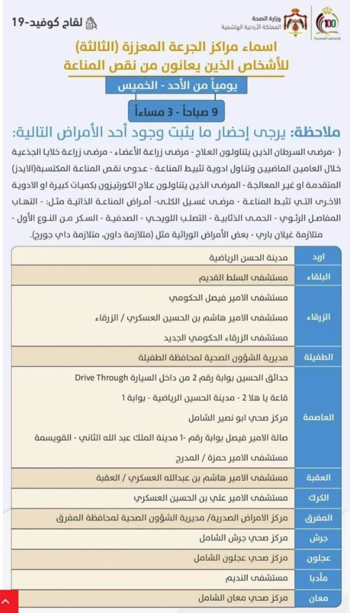 نشرت وزارة الصحة أسماء مراكز الجرعة المعززة (الثالثة) ضد فيروس كورونا، للأشخاص الذين يعانون نقص المناعة بأحد الأمراض المذكورة أدناه.