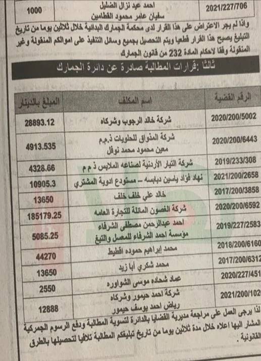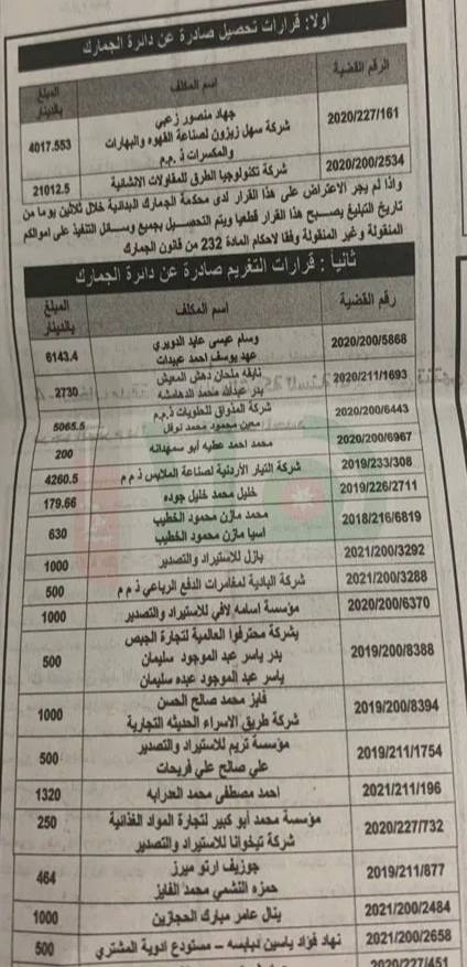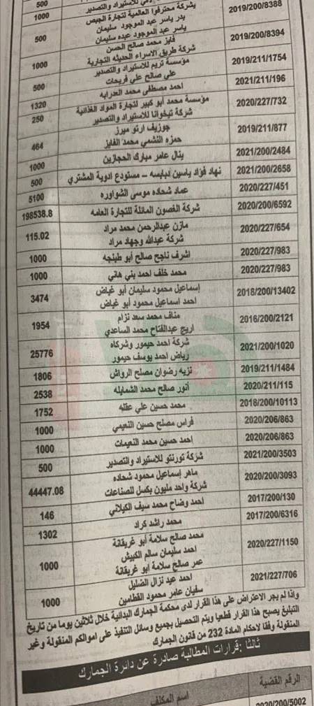 قرارات تغريم ومطالبة صادرة عن الجمارك (أسماء)