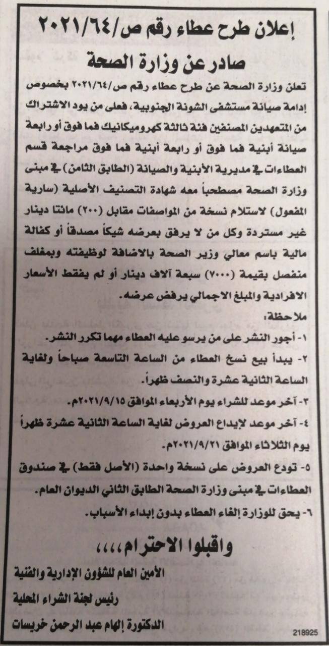 أعلنت وزارة الصحة، عن إعلان طرح عطاء لإدامة صيانة مستشفى الشونة الجنوبية.