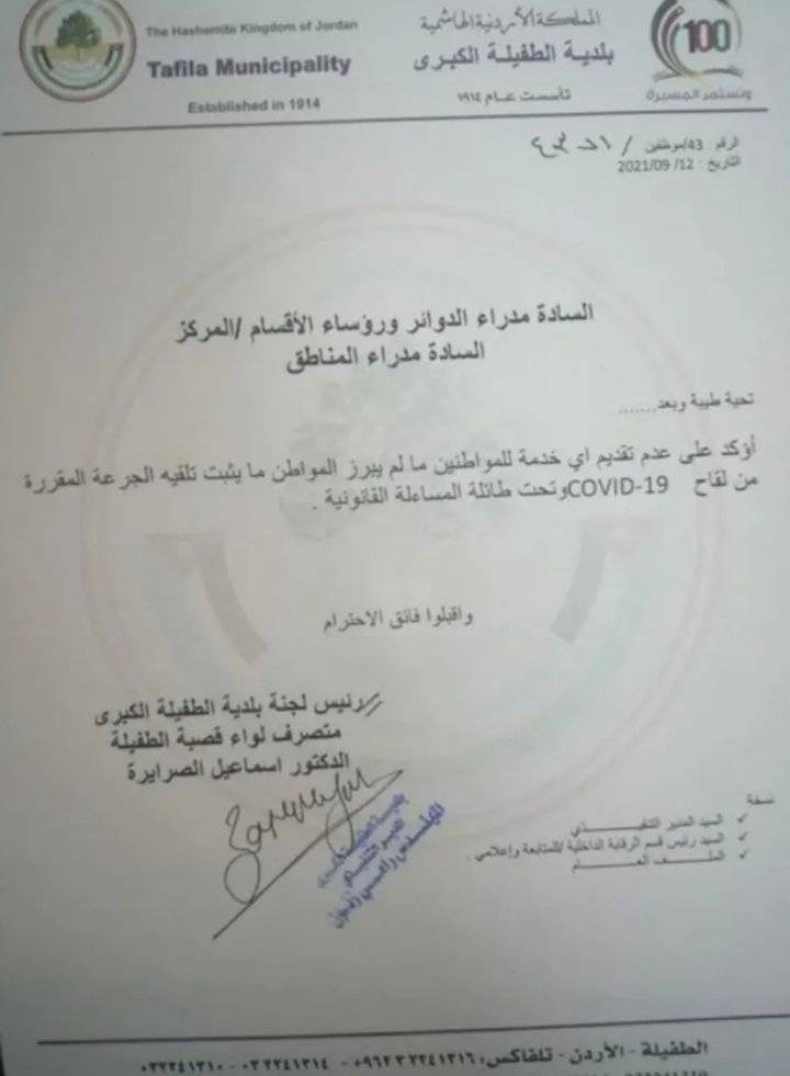 عمم رئيس لجنة بلدية الطفيلة الدكتور اسماعيل الصرارة بعد تقديم أية خدمات للمواطنين دون وجود ما يثبت أنه متلق للقاح.