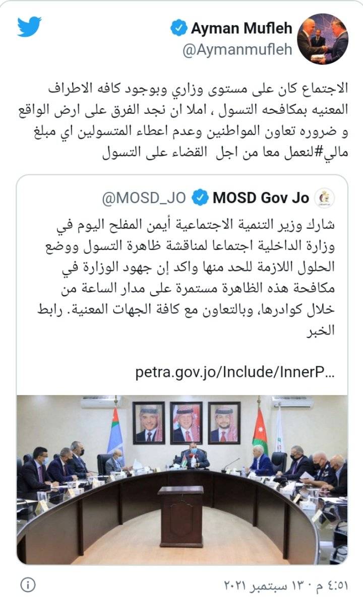 وقال المفلح، في تغريدة له عبر منصة تويتر، "الاجتماع كان على مستوى وزاري وبوجود كافة الأطراف المعنية بمكافحة التسول، املا أن نجد الفرق على ارض الواقع”