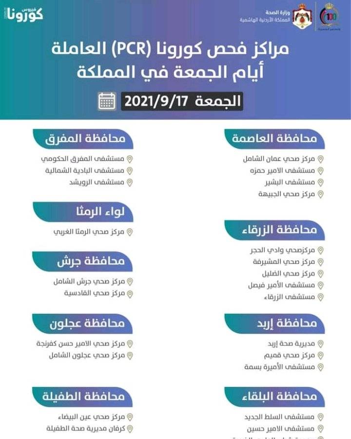مراكز فحص كورونا (PCR) العاملة يوم الجمعة 2021/9/17 في المملكة حسب التالي: