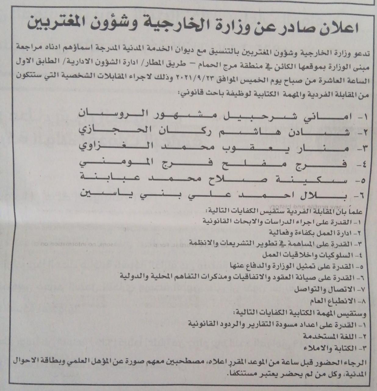 وزارة الخارجية وشؤون المغتربين تدعو مرشحين للتعيين للمقابلة الشخصية ...اسماء