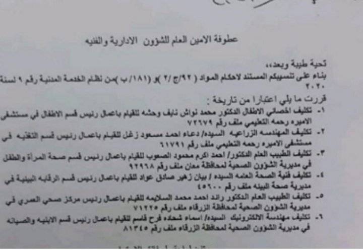 قرر وزير الصحة الدكتور فراس الهواري اجراء تشكيلات ادارية جديدة في عدد من المستشفيات والمراكز الصحية والمديريات بمحافظات.