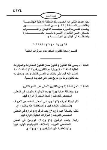 صدر في عدد الجريدة الرسمية يوم امس الخميس الارادة الملكية السامية بصدور القانون المعدل لقانون المخدرات والمؤثرات العقلية.