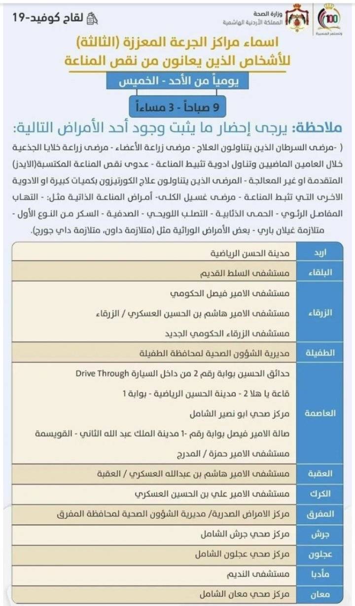 كما أعلنت وزارة الصحة عن أسماء مراكز الجرعة المعززة (الثالثة) المضادة لفيوس كورونا للأشخاص الذين يعانون من نقص المناعة بأحد الأمراض المذكورة أدناه.