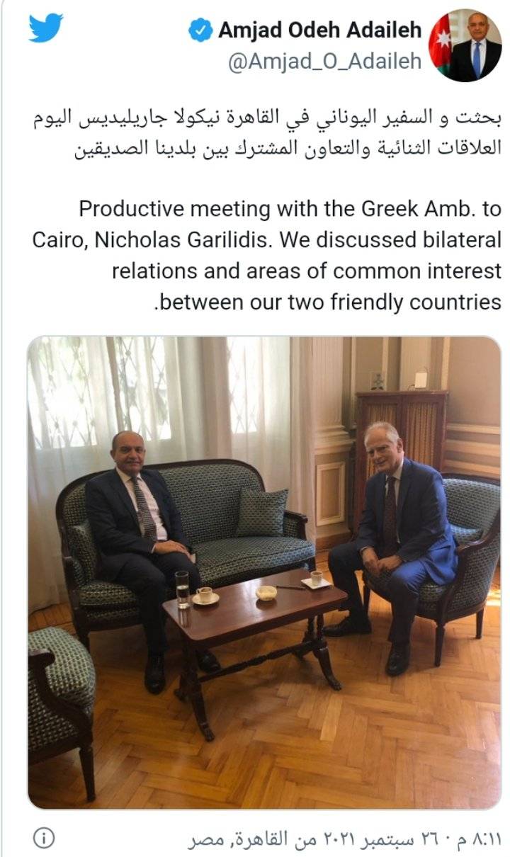 التقى مندوب الأردن في الجامعة العربية والسفير في القاهرة أمجد العضايلة السفير اليوناني في مصر نيكولا جاريليديس.