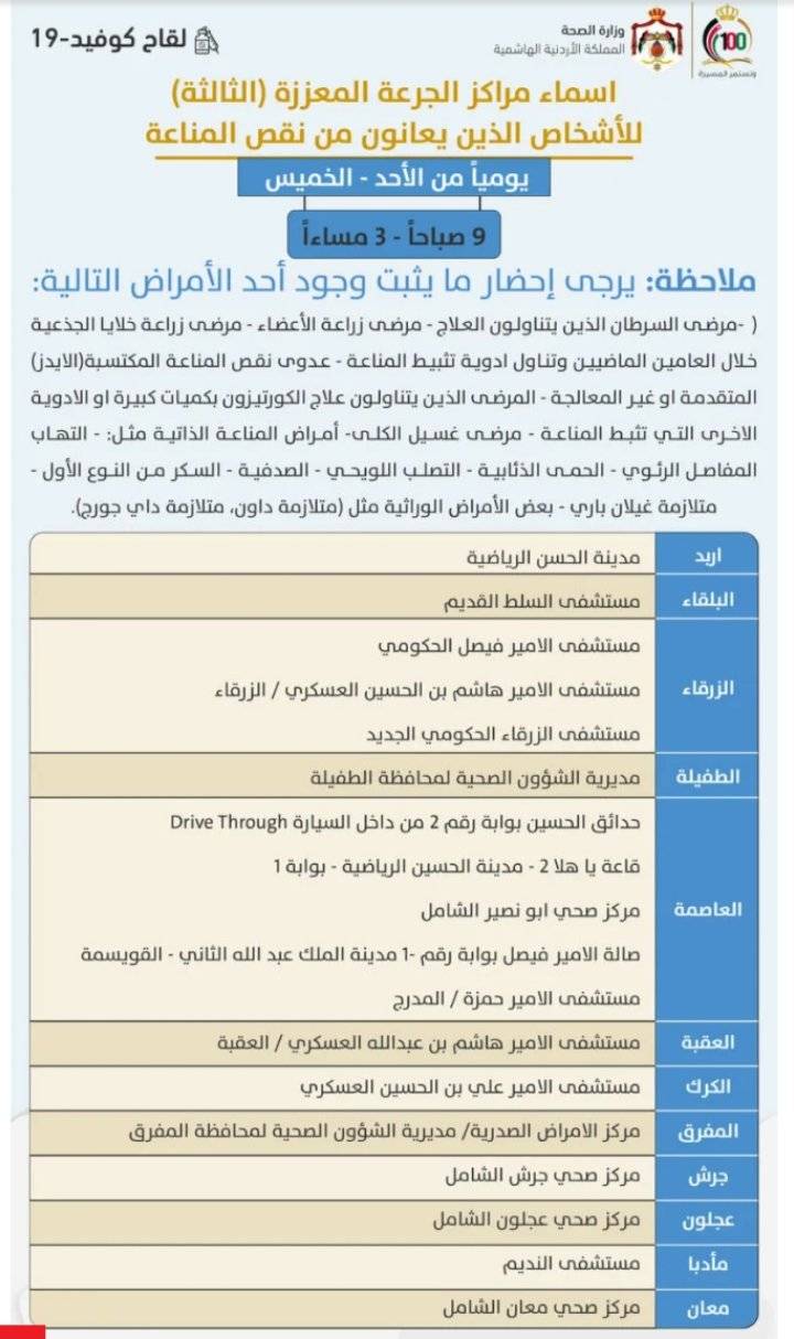 كما أعلنت وزارة الصحة عن أسماء مراكز الجرعة المعززة (الثالثة) المضادة لفيوس كورونا للأشخاص الذين يعانون من نقص المناعة بأحد الأمراض المذكورة أدناه.