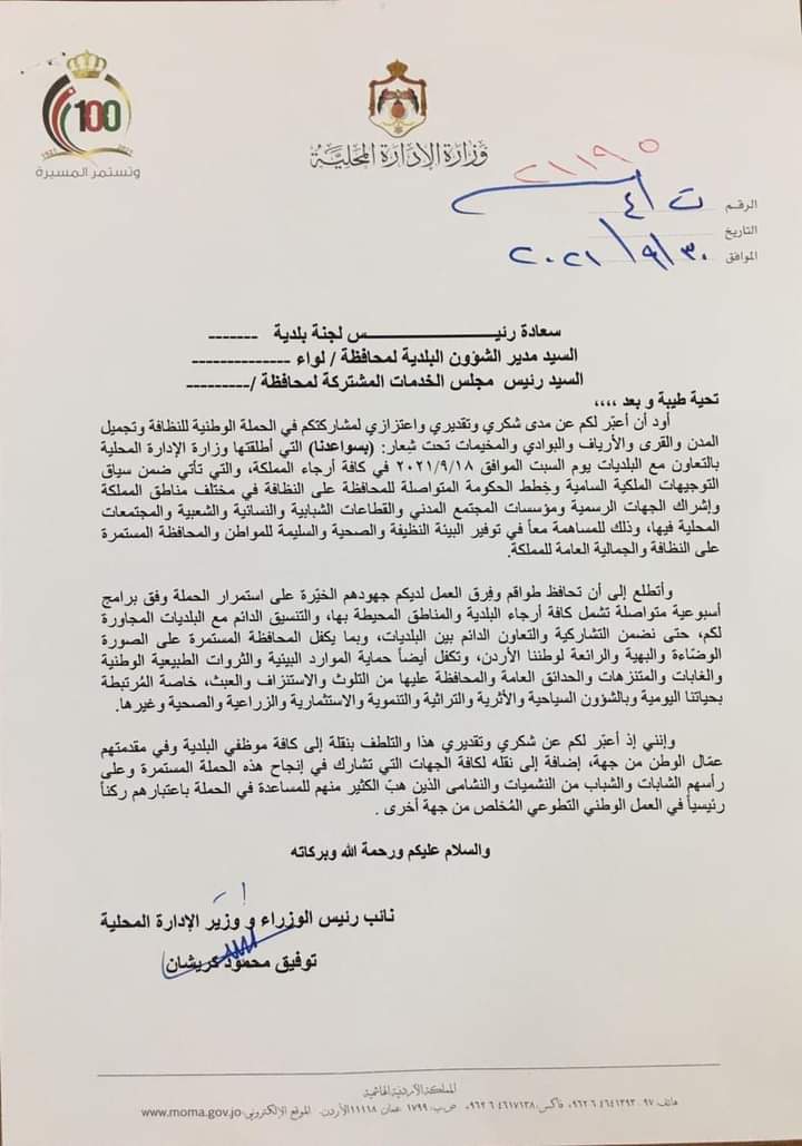 وجه نائب رئيس الوزراء ووزير الإدارة المحلية رسالة شكر وتقدير واعتزاز لرؤساء لجان البلديات ومدراء الشؤون البلدية ورؤساء مجالس الخدمات المشاركة لمشاركتهم في الحملة الوطنية للنظافة وتجميل المدن و القرى والارياف والبوادي والمخيمات تحت شعار بسواعدنا التي اطلقتها وزارة الإدارة المحلية بالتعاون مع البلديات يوم السبت ١٨ / ٩ /٢٠٢١ في كافة ارجاء المملكة .