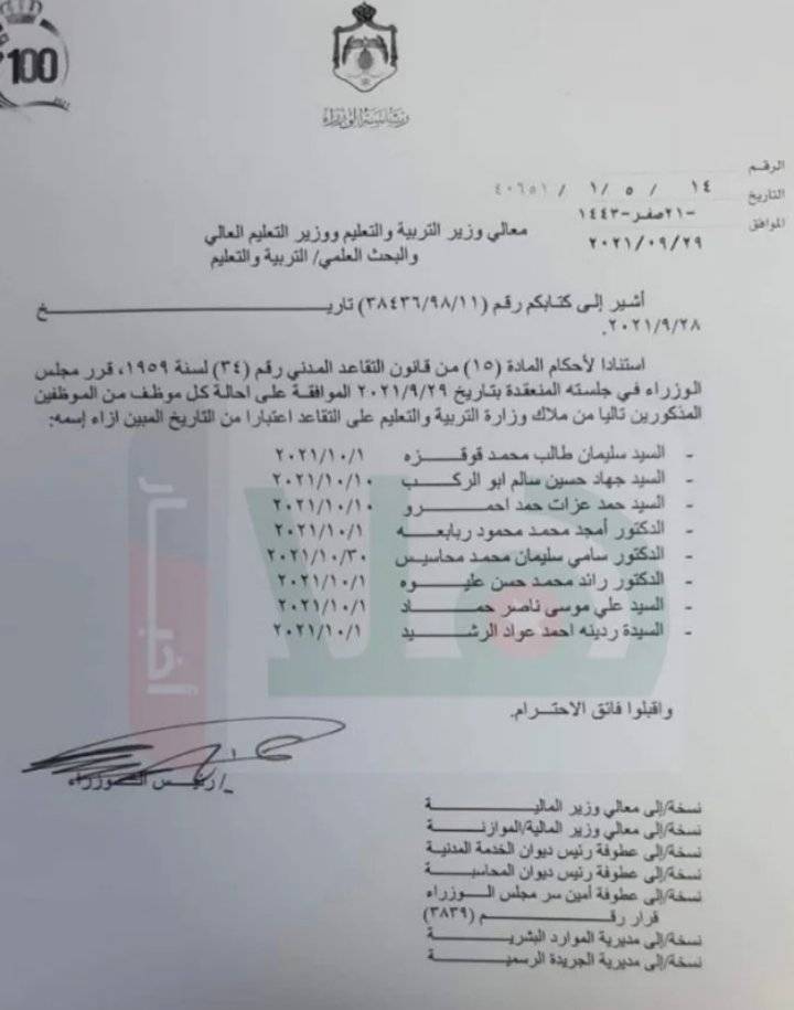 قرر مجلس الوزراء، الموافقة على إحالة 8 موظفين من ملاك وزارة التربية والتعليم، على التقاعد المبكر، اعتبارا من التاريخ المبين إزاء كل اسم.