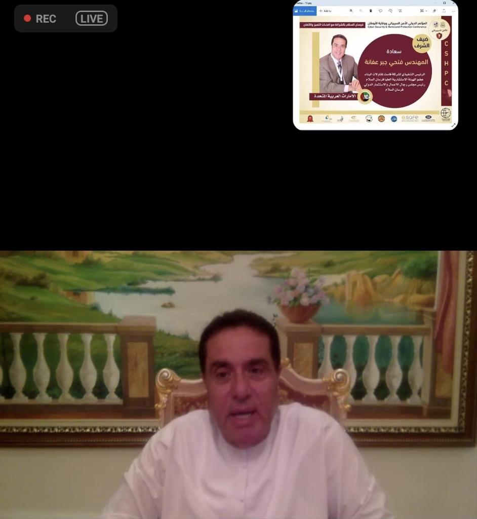 ودعا الى زيارة المعرض العالمي الذي يحاكي الاستدامة والسلام وتحدث عن فخره لانتماءه لفرسان السلام والذي ينتظر دائما مبادراتها المتعددة في الطرح الاهم على الساحة الدولية معربا عن شكره للقائمين على هذا المؤتمر يخص رئيس فرسان السلام والحضور لانجاح الرسالة للمؤتمر وتحدث عن التطور النامي المتسارع العالمي للتقنية وانها شريان الرئيسي للحياة و الثروة الهائلة و المعرفة عن مخاطر الهجمات الالكترونية والتي تهدد المجتمعات وتطرق عن ارقام حقيقية للمخاطر وعن اخد الاحتياطيات والاستراتجيات لصد هذه الهجمات وعن القرصنة السيبرانية وان التحصن من هذه الافة لابد انها بتكاتف الدول والعالم والشمولية وتسخير كافة القطاعات التشريعية والقضائيةوغرس الوعي المجتمعي وتحدث عن الدور الكبير لدولة الامارات العربية المتحدة عن صدها هذه المخاطر وتفعيل الجاهزية لرد الاستباقي وفق افضل الممارسات العالمية وتعزيز المنظومة الامنية وتلاحم بين الدول العربية مختتماً كلمته متمنيا النجاح والخروج بتوصيات هامة .