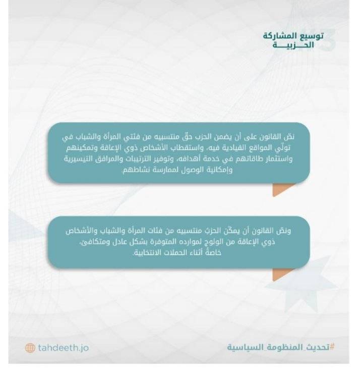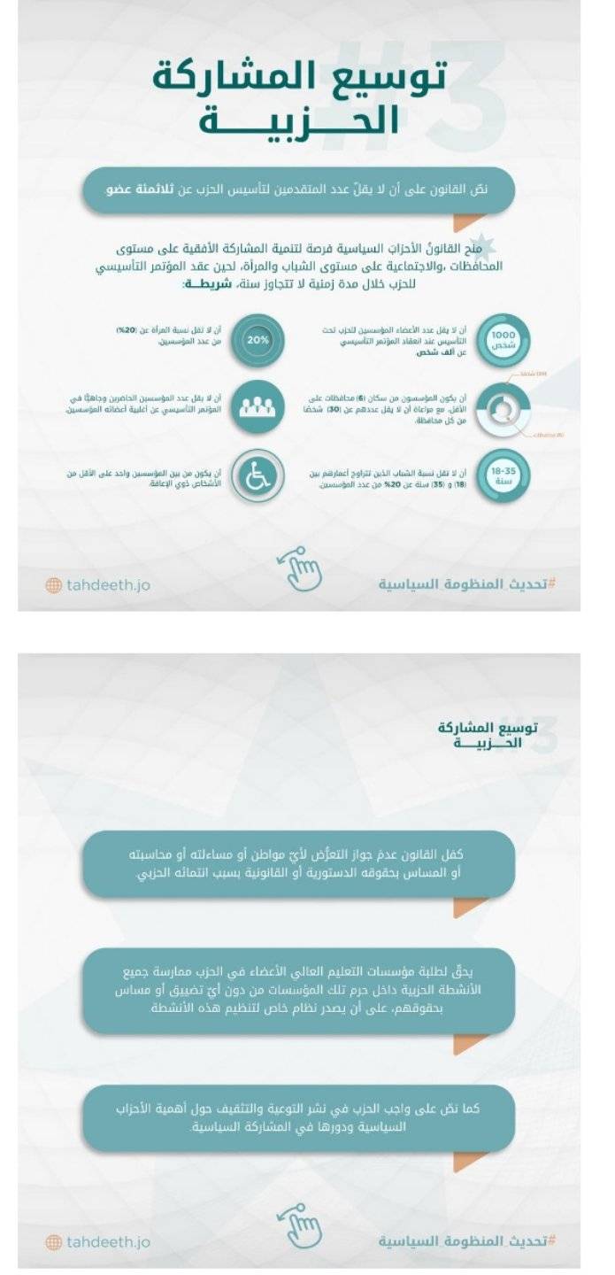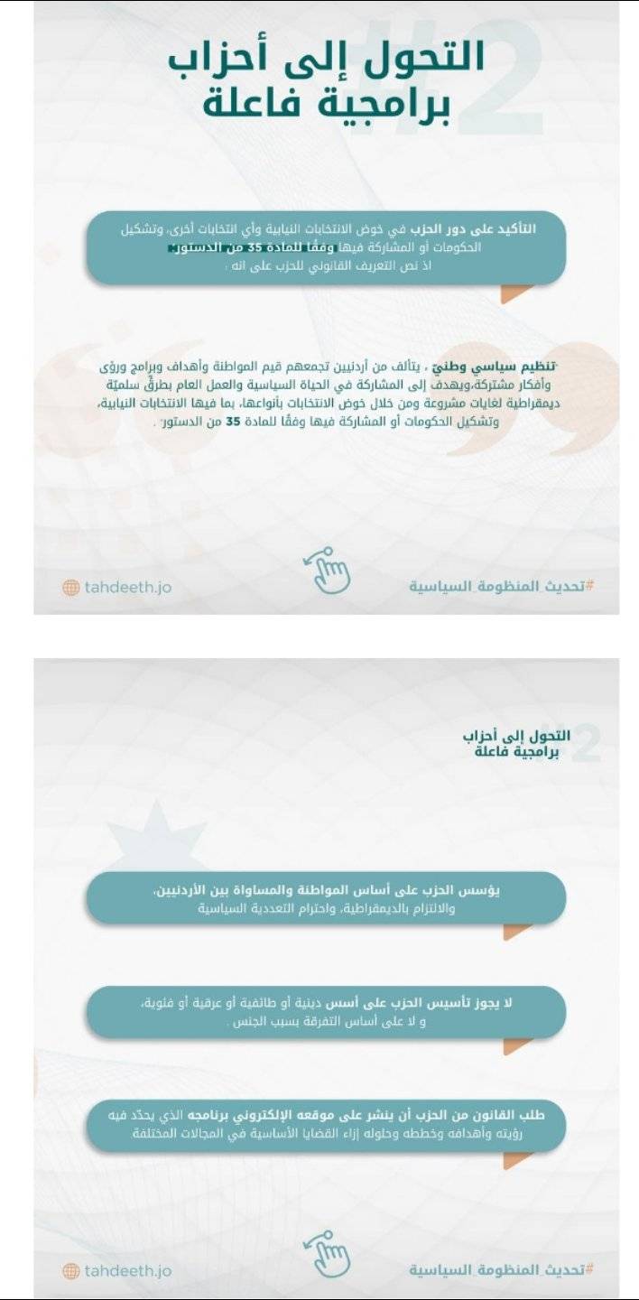 وشملت مسودتي مشروعي قانونين جديدين للانتخاب والأحزاب السياسية، والتعديلات الدستورية المتصلة حكما بالقانونين وآليات العمل النيابي، إضافة إلى التوصيات المتعلقة بتطوير التشريعات الناظمة للإدارة المحلية، وتهيئة البيئة التشريعية والسياسية الضامنة لدور الشباب والمرأة في الحياة العامة.