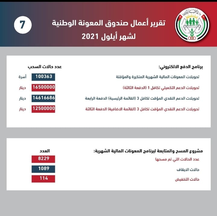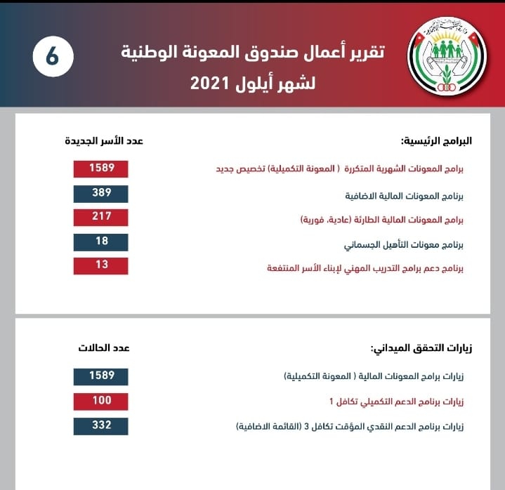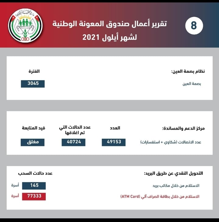 ووفقًا لتقرير أعمال صندوق المعونة الوطنية لشهر أيلول، بلغ عدد الأسر الجديدة المستفيدة من المعونة الشهرية المتكررة 1589 أسرة، فيما جرى إيقاف المعونة الشهرية المتكررة عن 1089 أسرة، إضافة إلى تخفيض المعونة الشهرية المتكررة لـ 114 أسرة.