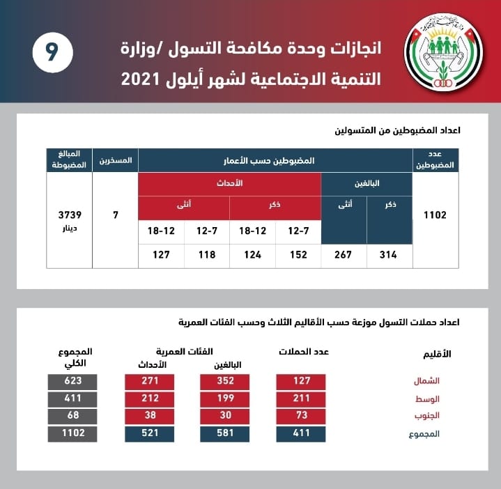 وضبطت مديرية مكافحة التسول1102 متسول ، وأجرت 1102 حملة، وضبط 7 مسخرين، فيما بلغ مجموع المبالغ المضبوطة 3739 دينارًا، وأجرت الوزارة 708 دراسات متعلقة بحالات الأحداث، إذ دخل إليها 390 حدثًا خلال شهر أيلول الماضي، كما أجرت 1363 دراسة لطلب الحصول على إعفاء من رسوم تصريح العمل.
