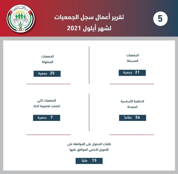 وفيما يتعلق بالسجل العام للجمعيات، قال خريس، إنه جرى تسجيل 21 جمعية، وحل 25 جمعية، و7 جمعيات انضمت لعضوية اتحاد، وجرت الموافقة على 56 نظاما أساسيا معدلا، والموافقة لـ 15 جمعية للحصول على التمويل الأجنبي.