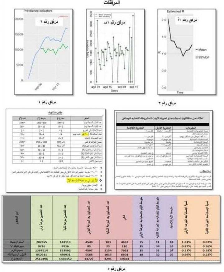 كما أنها أصدرت مخطط يوضح شدة الوباء الذي يعتمد على عدد من المفردات والذي يبين شدته في كل إقليم على حده، لتمكين صاحب القرار في اتخاذ الإجراءات ذات التأثير الاقتصادي الواضح ليشتمل منطقة محددة بعينها  لتقليل الآثار السلبية وخلق توازن مقبول بين الاقتصاد والصحة، هذا وبالإضافة إلى إيجاد مخطط يحدد مسار الجائحة الحالية مقارنة بما سبقها مما يسهل من قدرة صانع القرار على إجراء تسلسل زمني في الانفتاح اعتماداً على سير افتراضي أقرب إلى الحقيقة بحيث يستمر بنفس الانفتاح بشكل مدروس ومراقب يُمكن من خلاله  صاحب القرار إعادة تقييم الإجراءات المتخذة من تعديل في سرعة الانفتاح، كما أن القيادة العامة للقوات المسلحة أدخلت نموذج هلسنكي والمتفق عليه عالميا ًبأن 40% من الحالات تكون غير مكتشفة ويجب إضافتها إلى ما يتم إعلانه من قبل الجهات المختصة مما يساعد على إعطاء فكرة أوضح عن وضع الوباء بالأردن والتقليل من أثر تذبذب عمل الفحوصات لظروف مختلفة، هذا وكانت القوات المسلحة بالتعاون مع وزارة الاقتصاد الرقمي والريادة أول من قام بدراسة مأمونية وفعالية المطاعيم المعمول بها داخل المملكة وخرجت بنتيجة أن الإصابات بعد الجرعة الثانية كانت 3 لكل 10 آلاف تناولوا المطعوم ومعظمها إصابات خفيفة لا تستدعي الدخول للمستشفيات وأن لا فروق احصائياً بين هذه المطاعيم على اختلاف مصادرها، وفق البيان.