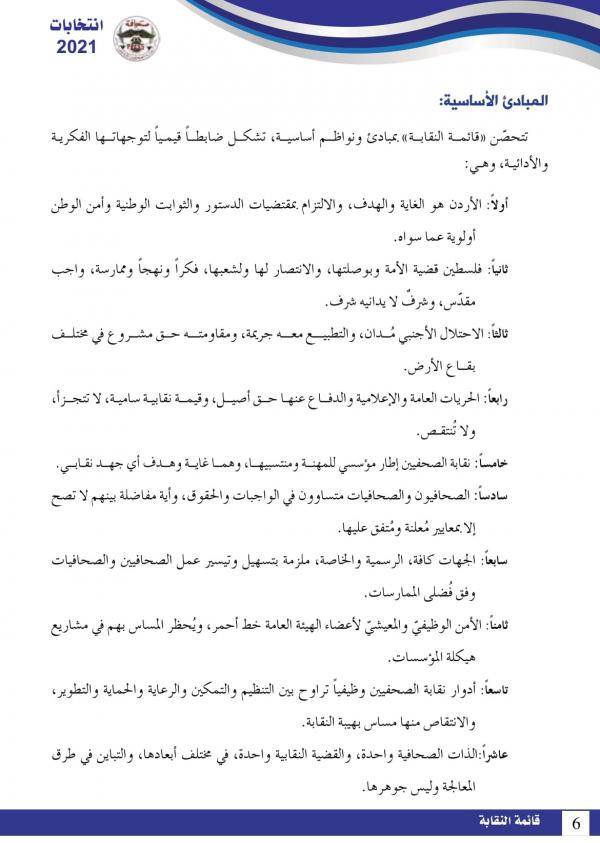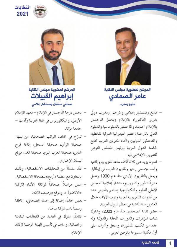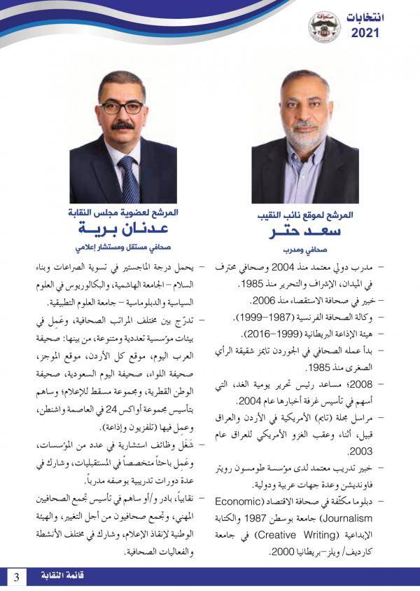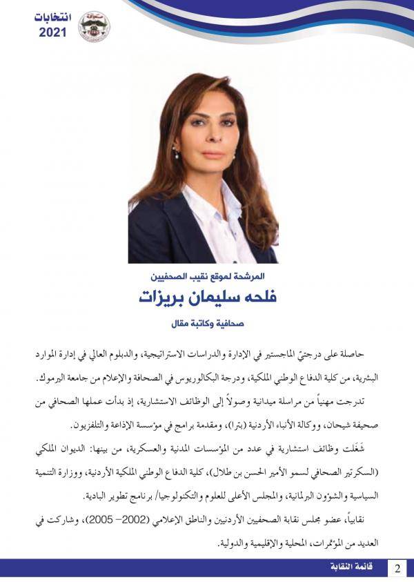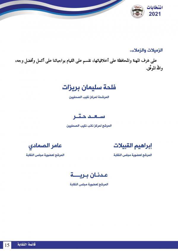 وتتألف القائمة من الزملاء: فلحة بريزات مرشحة لموقع النقيب، وسعد حتر المرشح لموقع نائب النقيب، وكل من إبراهيم القبيلات وعامر الصمادي وعدنان برية لعضوية المجلس.