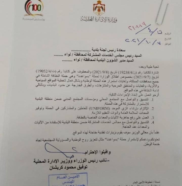 اوعز نائب رئيس الوزراء ووزير الادارة المحلية توفيق كريشان على استمرار الحملة الوطنية التي اطلقتها الوزارة تحت شعار بسواعدنا وبشكل فعال لتغطية المواقع السياحية والاثرية والغابات والمناطق الحرجية والمتنزهات والطرق الخارجية عن حدود البلديات وبالتالي ادامة النظافة في هذه المواقع.