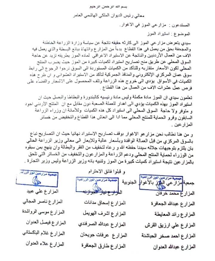 رفع مزارعو الموز رسالة الى الديوان الملكي الهاشمي ، متهمين فيها وزارة الزراعة بالتسبب بكارثة للقطاع ، نتيجة السياسات الخاطئة المتبعة من قبلهم.