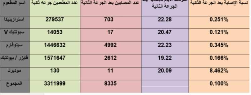 وأشار مستشار رئيس هيئة الأركان المشتركة للشؤون الطبية أن الدراسات بينت عدد المصابين بعد الجرعة الثانية والتي جاءت بنسبة (110000) مقارنة بـ (310000) في التحديث الثالث ومعظمها كانت في الفترة ما بين أسبوعين إلى 6 أسابيع وهي فترة تكون المناعة، وبينت الإحصائية أيضاً عدم وجود فروق ذات قيمة بين المطاعيم الأكثر استخداماً وأن معظم الإصابات كانت خفيفة.