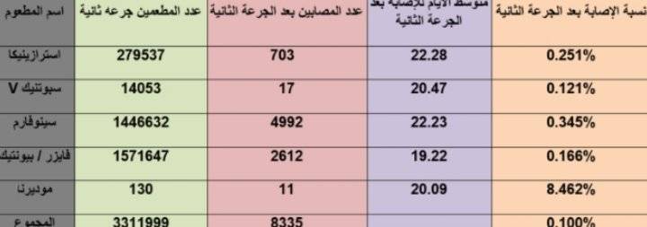 وأشار إلى أن الدراسات بينت عدد المصابين بعد الجرعة الثانية والتي جاءت بنسبة (110000) مقارنة بـ (310000) في التحديث الثالث ومعظمها كانت في الفترة ما بين أسبوعين إلى 6 أسابيع وهي فترة تكون المناعة، وبينت الإحصائية أيضاً عدم وجود فروق ذات قيمة بين المطاعيم الأكثر استخداماً وأن معظم الإصابات كانت خفيفة.