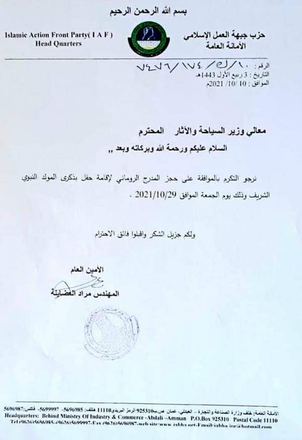 نيروز الإخبارية : خاطب حزب جبهة العمل الإسلامي، وزارة السياحة والآثار، لحجز المدرج الروماني يوم الجمعة 2021/10/29، وذلك لإقامة حفل عيد المولد النبوي الشريف.
