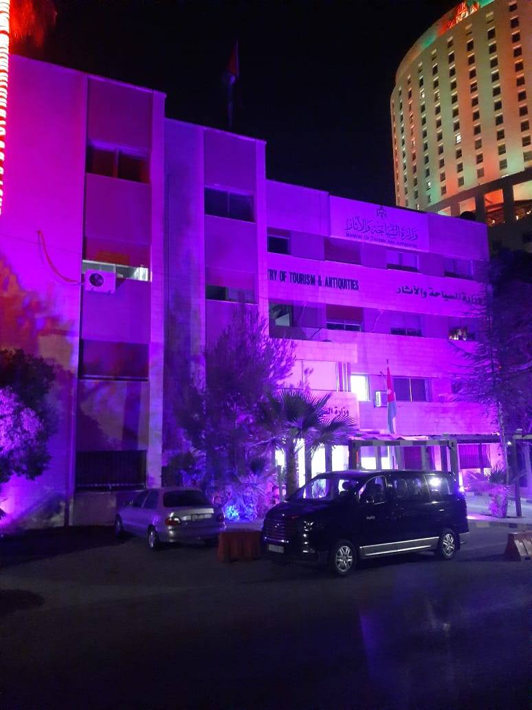 وقامت الوزارة أمس الاثنين، بإضاءة مبناها وذلك دعما لحملة " فكر بالوردي"،  حيث ستستمر بإضاءة المبنى لمدة أسبوع، وكذلك ستقوم بإضافة شعار الحملة على تطبيق برنامج أردننا جنة وعلى موقع الوزارة الرسمي.
