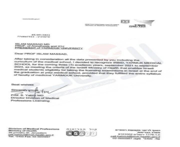 جاء ذلك عبر رسالة بعثها "شاؤول يتسف " مدير تراخيص المهن الطبية في وزارة الصحة الاسرائيلية الى رئيس جامعة اليرموك د. اسلام المساد .