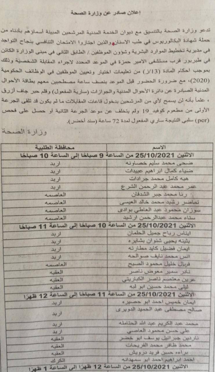 دعت وزارة الصحة، اليوم الخميس، بالتنسيق مع ديوان الخدمة المدنية، عدداً من المرشحين لاجراء المقابلات الشخصية لغايات التعيين.