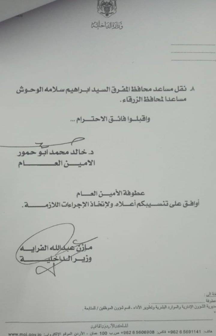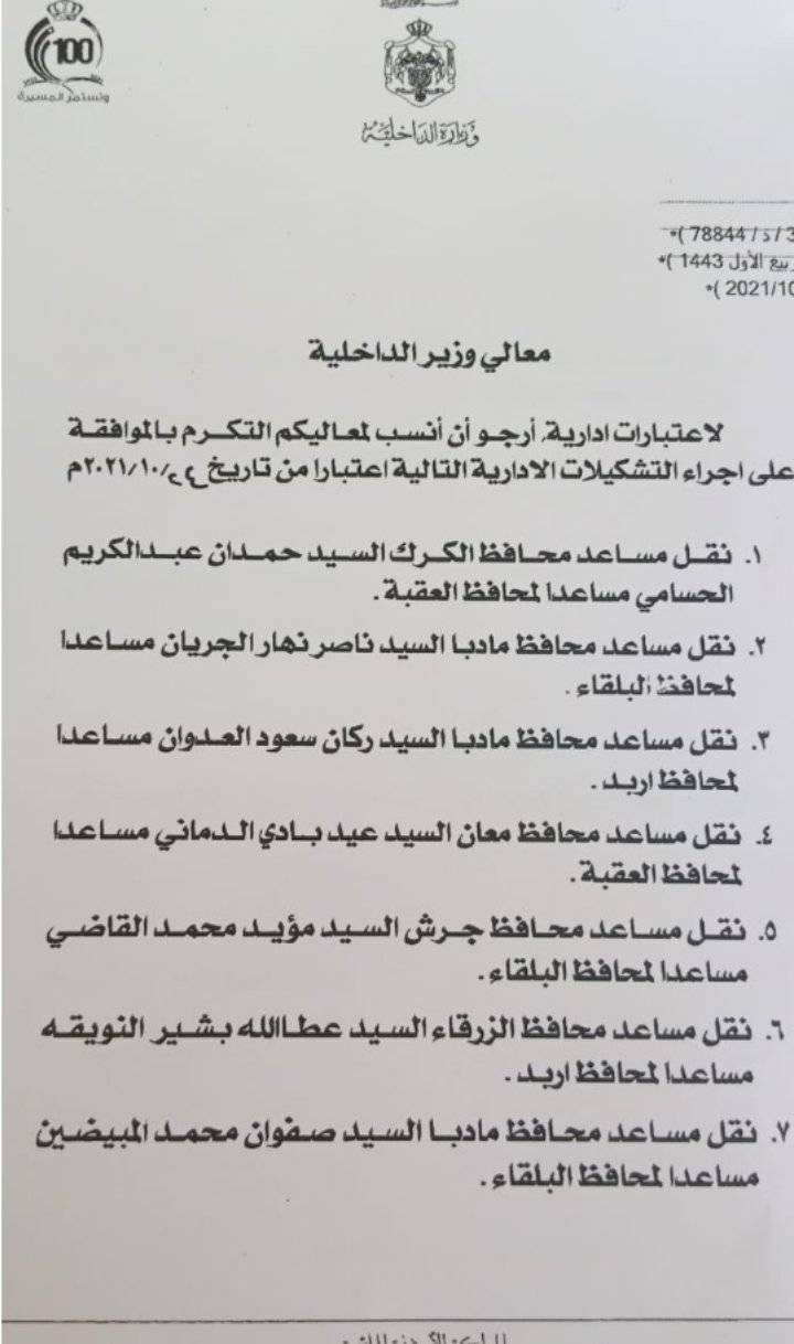 قرر وزير الداخلية مازن الفراية اجراء تشكيلات ادارية اعتبارا من تاريخ 24/10/2021.