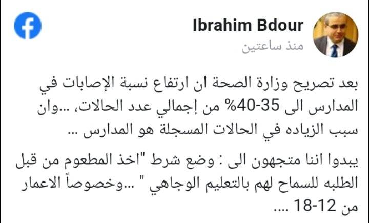 وقال الهواري في منشور له عبر صفحته الشخصية على فيسبوك : بعد تصريح وزارة الصحة ان ارتفاع نسبة الاصابة بفيروس كورونا الى 40% بين طلبة المدارس وان سبب الزيادة في الحالات المسجلة هو المدارس يبدوا اننا متجهون الى وضع شرط اخذ المطعوم من قبل الطلبة للسماح لهم بالتعليم الوجاهي، وخصوصاً الاعمار من 12-18 سنة.