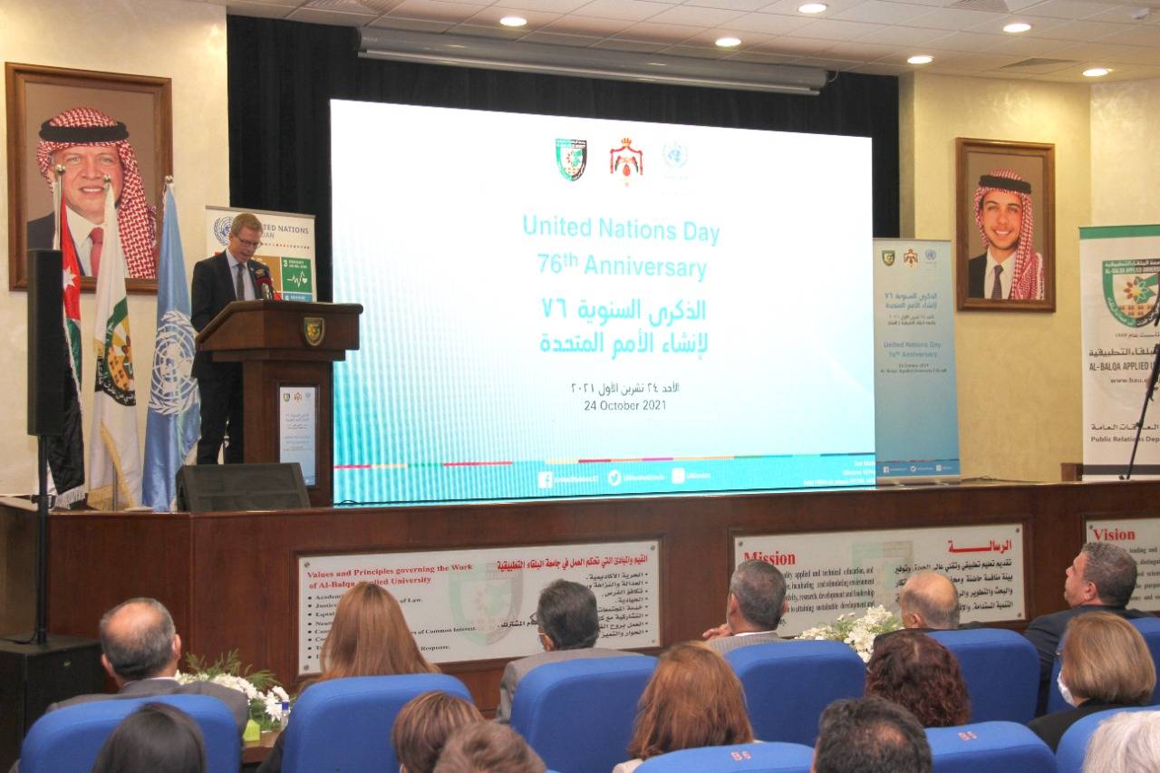 نظم فريق الأمم المتحدة في الأردن اليوم بالتعاون مع جامعة البلقاء التطبيقية والتنسيق مع وزارات السياحة والزراعة والبيئة فعالية علمية بمناسبة الذكرى السادسة والسبعين لانشاء الأمم المتحدة وعرض السياسات الوطنية المرتبطة بالتغير المناخي برعاية ضيف الشرف نائب رئيس الوزراء ووزير الإدارة المحلية معالي السيد توفيق كريشان وحضور رئيس جامعة البلقاء التطبيقية الأستاذ الدكتور عبدالله سرور الزعبي ومعالي الدكتور جواد العناني رئيس مجلس أمناء الجامعة وعطوفة محافظ البلقاء الدكتور فراس ابو قاعود وسعادة السيد اندريس بيدرسون المنسق المقيم للأمم المتحدة في الأردن وعدد من سفراء الدول الصديقة ونواب رئيس جامعة البلقاء التطبيقية.