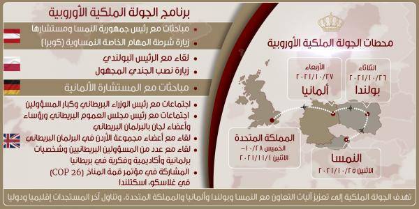 وتأتي زيارة جلالة الملك إلى المملكة المتحدة بعد جولة أوروبية بدأت الاثنين الماضي، شملت النمسا وبولندا وألمانيا، بهدف تعزيز آليات التعاون مع هذه الدول، وتناول آخر المستجدات إقليميا ودوليا.