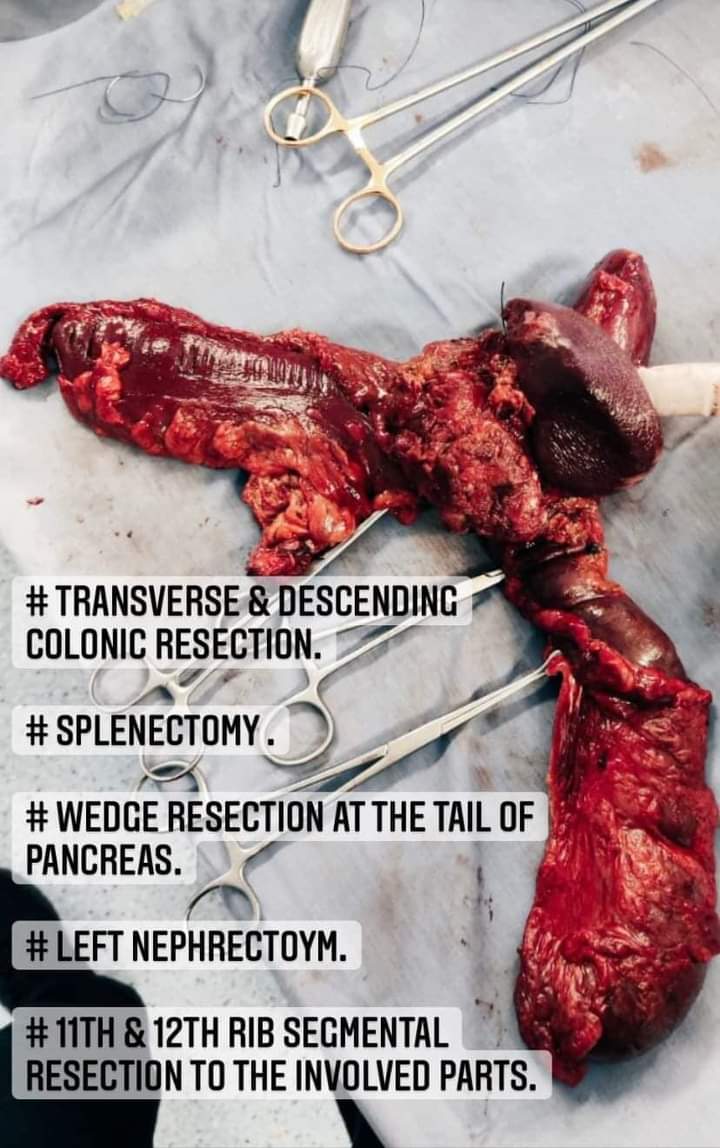 وقال ربيحات، أنه وبعد اجراء الفحوصات اللازمة للمريضة تبين أن الورم متطور موضعيا و منتشر إلى الأعضاء المجاورة حيث تم استئصال القولون الأيسر و الطحال و الكلية اليسرى و جزء من ذيل البنكرياس و أجزاء من عظم الضلعين الحادي عشر و الثاني عشر من أضلاع الصدر مع مراعاة حدود امان الورم.
