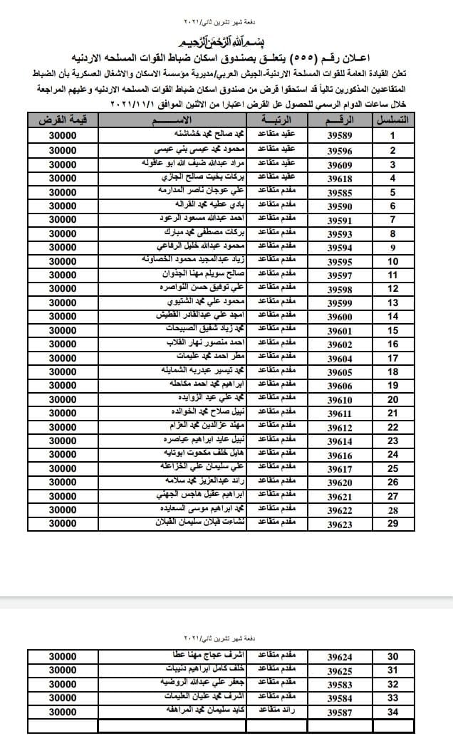 تعلن القيادة العامة للقوات المسلحة الأردنية / مديرية الإسكان والإشغال العسكرية بأن الضباط وضباط الصف والأفراد المذكورين تالياً قد استحقوا قرض من صدنوق الإسكان العسكري لمتابعة الموقع الإلكتروني للقوات المسلحة الأردنية وموقع مديرية الإسكان والعسكرية لمعرفة أسماء المستحقين الذين سيتم تحويل قيمة قروضهم إلى بنك القاهرة عمان.