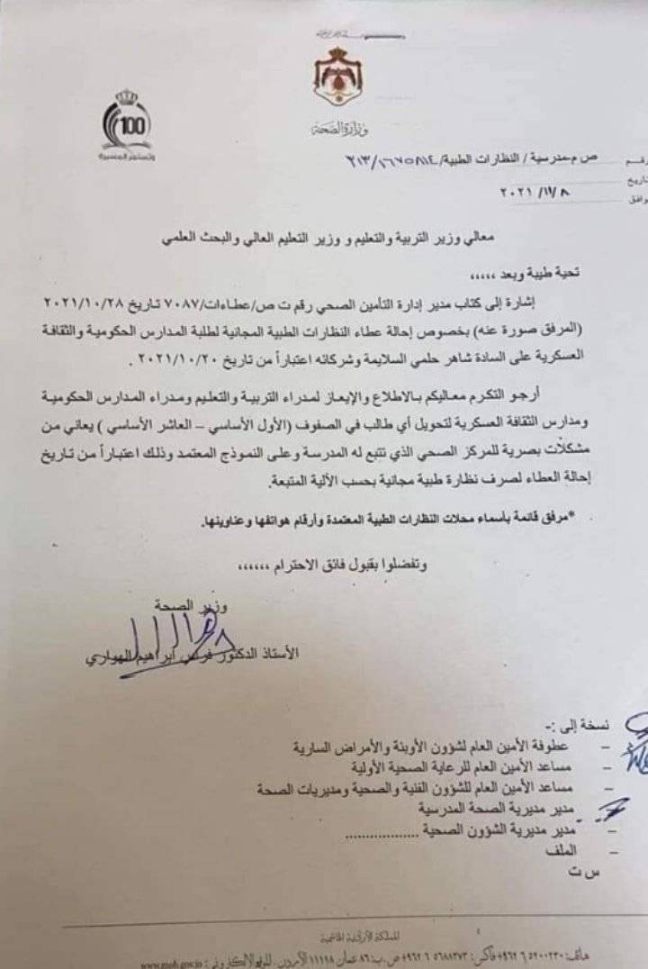 وجهه وزير الصحة فراس الهواري الى وزير التربية والتعليم وجيه عويس كتاباً ، طلب خلاله الإيعاز  لمدراء التربية والتعليم ومدراء المدارس الحكومية والثقافة العسكرية لتحويل أي طالب في الصفوف من الأول الى العاشر، ممن يعانون من مشكلات بصرية الى المركز الصحي الذي يتبع مدرسته وعلى النموذج المعتمد اعتبارا من تاريخ إحالة عطاء النظارات الطبية المجانية لطلبة المدارس بحسب الآلية المتبعة .