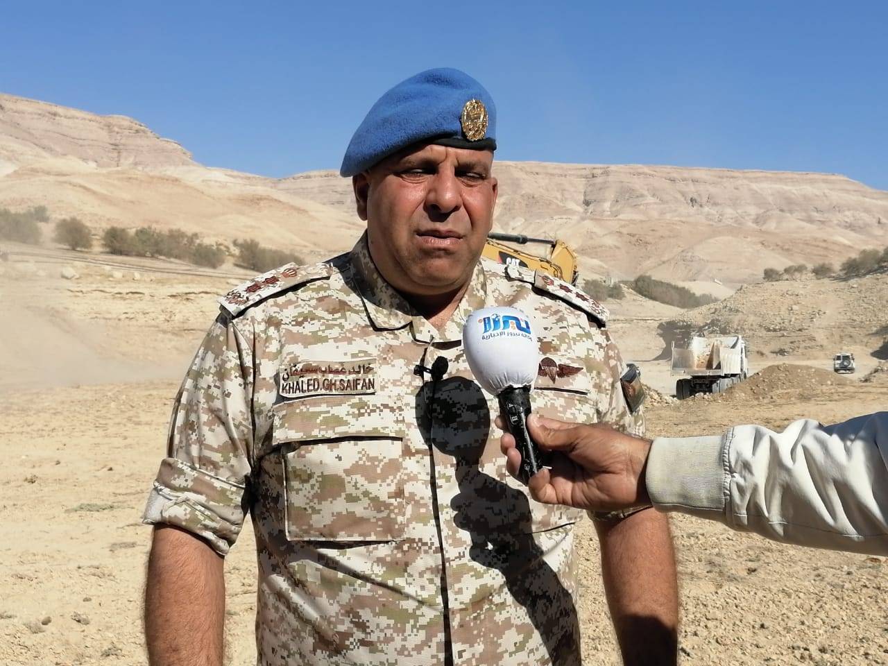 وقال العقيد سعيفان أن سلاح الهندسة الملكي ينفذ توجيهات القيادة العامة للقوات المسلحة الأردنية وذلك للمساهمة في  التنمية المستدامة والمساهمة في خدمة المجتمع من خلال شراكتنا مع وزارة المياه ممثلة بسلطة وادي الاردن لتنظيف سد الموجب من الطمي والرسوبيات وانجزنا 70% من العمل في تنظيف الاودية التي تصب في سد الموجب كما تم الاتفاق بين القوات المسلحة الأردنية وسلطة وادي الأردن على إزالة 250 الف متر مكعب الطمي في سد الموجب والعمل يجري بهمة عالية لانجاز هذه المهمة.