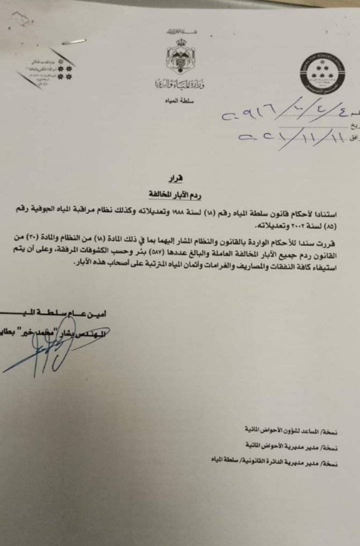 قررت وزارة المياه والري – سلطة المياه ردم جميع الآبار المخالفة العاملة والبالغ عددها 587 بئرا وحسب الكشوفات المرفقة، بحسب قرار لأمين عام سلطة المياه بشار بطاينة.