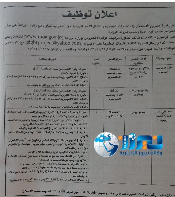 واشار الاعلان الى أنه على الراغبين التقدم للوظائف المذكورة مراجعة الموقع الإلكتروني لوزارة الزراعة للاطلاع على وصف المهام وارسال السيرة الذاتية والوثائق المطلوبة على الايميل sightproject@yahoo.com مع ذكر مسمى الوظيفة .